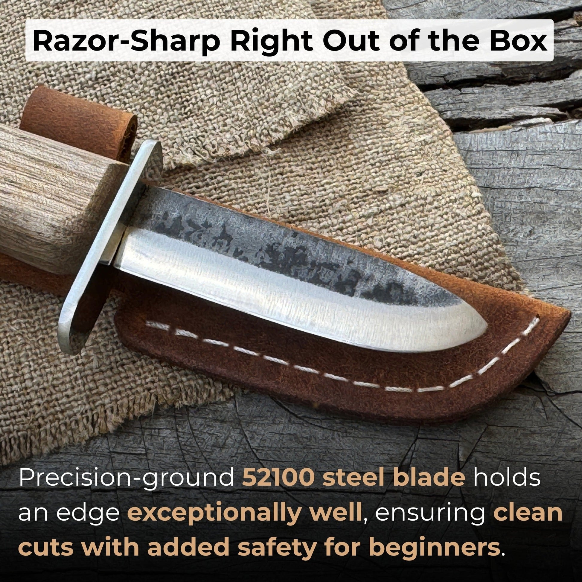 This woodcarving knife is thoughtfully crafted for children, teenagers, and beginner woodworkers who are just starting their journey in carving. Featuring a short, sharp carbon steel blade and an ergonomically shaped ash wood handle, it offers a safe, comfortable grip and excellent control. The included leather sheath ensures secure storage and transport, making it an ideal starter knife for learning basic carving skills with confidence.