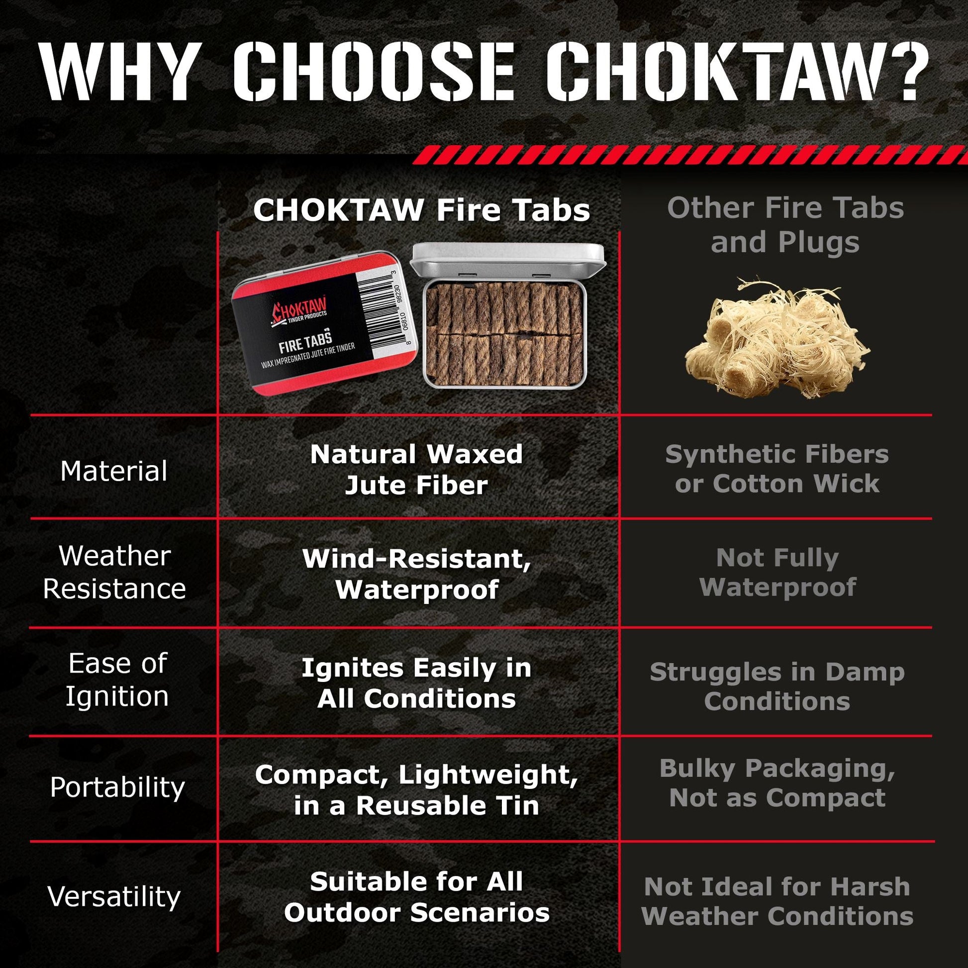 - RELIABLE WARMTH - CHOKTAW Fire Tabs are made from the same waxed jute fiber used in our patented SurvivorCord®, found in U.S. Embassy Survival Kits around the world, and trusted by Veterans and Bushcrafters everywhere. It is wind-resistant, waterproof, and ignites easily even on damp or windy days.