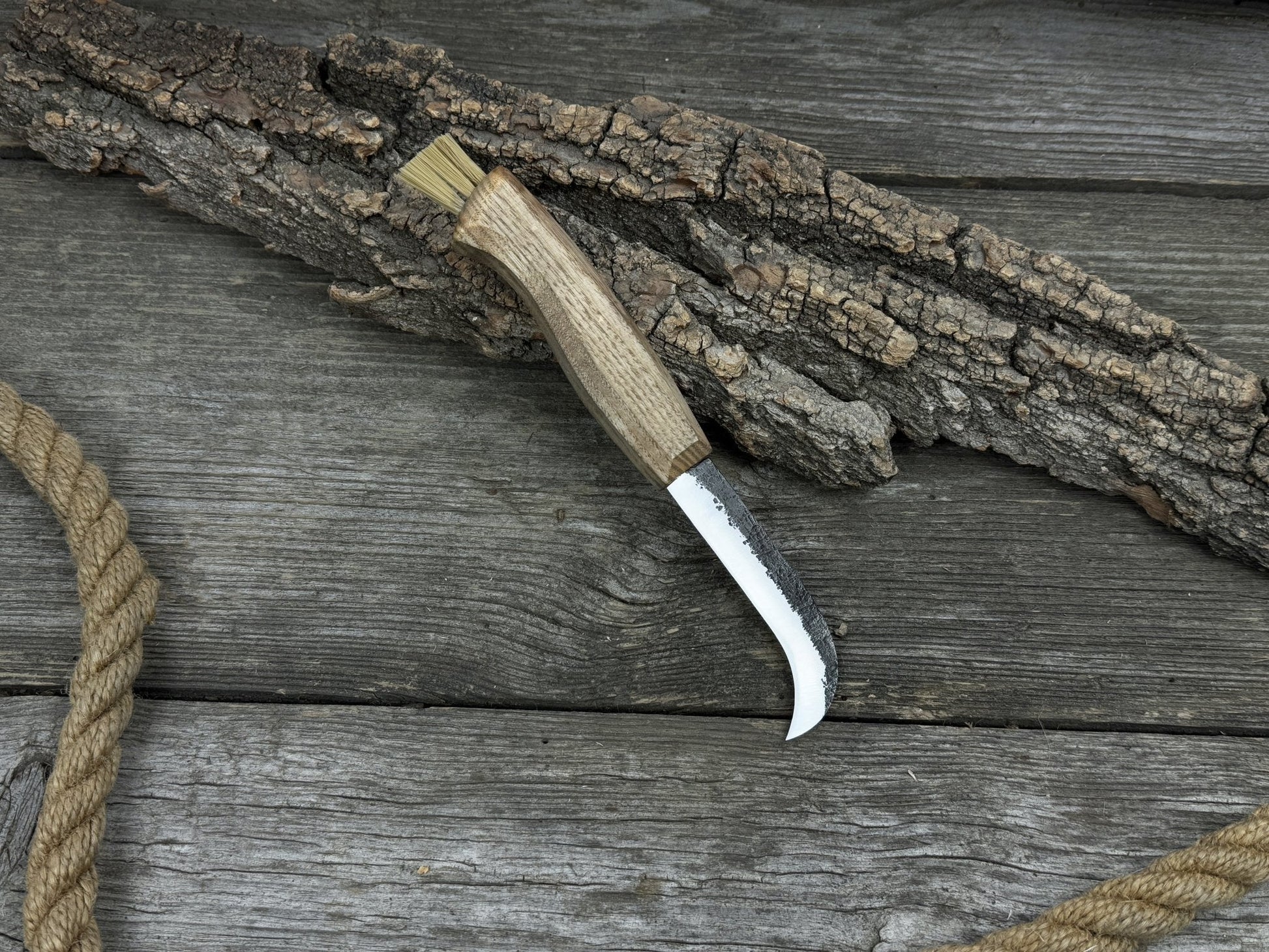 This expertly crafted mushroom knife is designed for those who value both precision and functionality while foraging for mushrooms. With a sharp 52100 carbon steel blade and a convenient built-in brush, this knife ensures that mushrooms are harvested cleanly and with care, preserving their delicate nature. The ergonomic ash wood handle offers a comfortable grip, making it easy to use for extended periods in the field, while the included leather sheath provides safe and convenient storage.